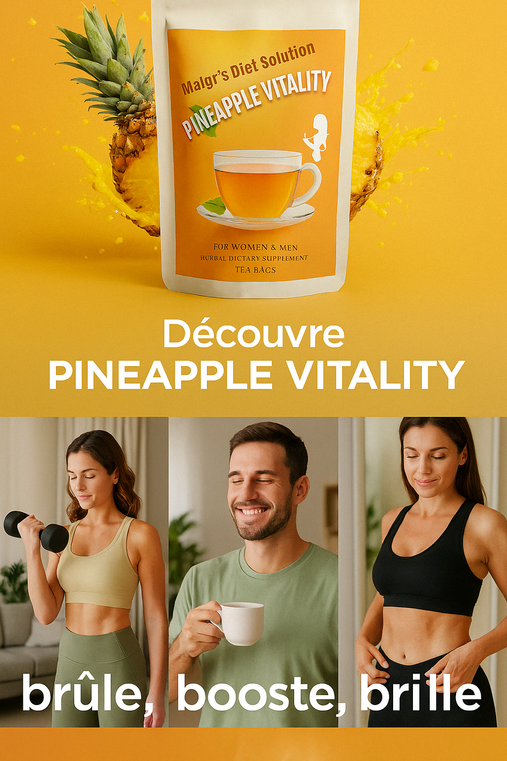 Ananas Vitalité: Let yourself be captivated by an exceptional detox tea infused with the natural benefits of pineapple. Designed to revitalize and purify your body, this unique blend boosts your energy, supports smooth digestion, and enhances your skin’s natural glow.